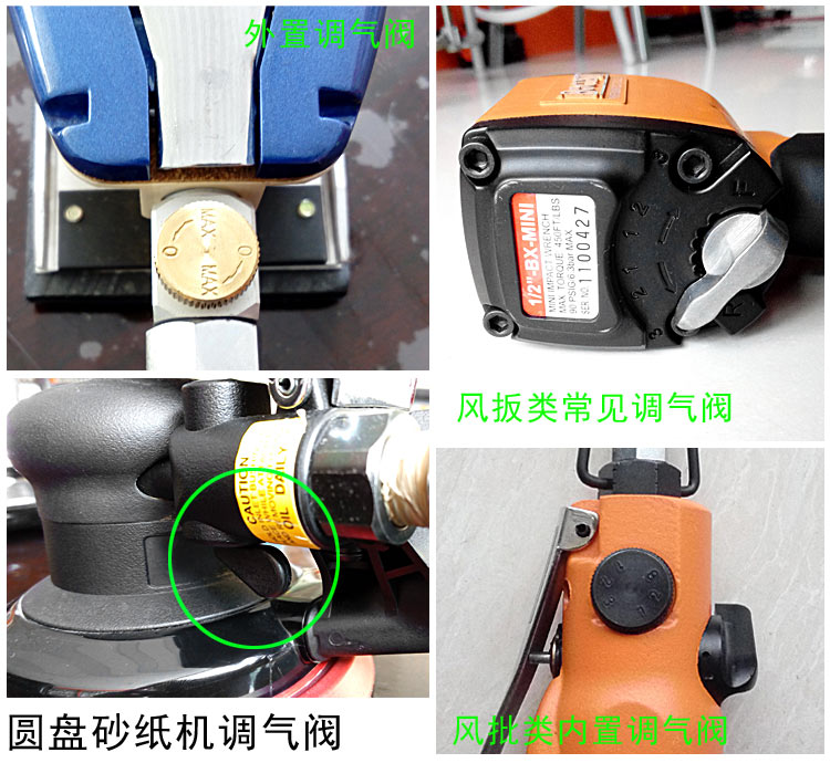 一般情況下,氣動(dòng)工具產(chǎn)品都自帶有調(diào)檔開關(guān),或配備加裝的調(diào)氣閥,這些都是調(diào)整工具轉(zhuǎn)速的直觀部件。如下圖: