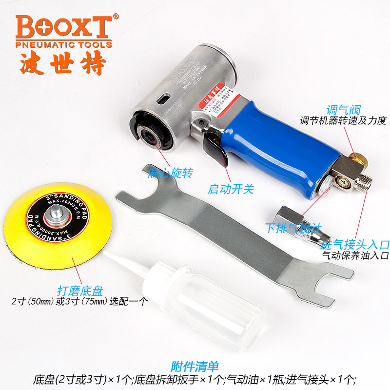 • 產(chǎn)品參數(shù): 底盤尺寸:50/75mm(M8螺牙托盤)【2/3寸】 偏擺直徑:3mm 空載轉(zhuǎn)速:11000rpm 工具全長:172mm 重 量:0.78kg 耗 氣 量:0.38m3/min 【工業(yè)型/帶偏心】