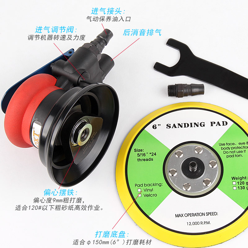 • 產(chǎn)品參數(shù): 底盤尺寸:150mm 空載轉(zhuǎn)速:11000rpm 偏擺直徑:9mm 重 量:0.9kg 耗 氣 量:1.6cfm/min(粗磨)
