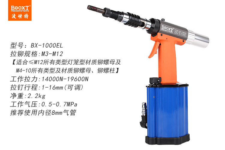 東莞市強勁五金工具有限公司提供BOOXT波世特品牌氣動工具,燈籠鉚螺母專用槍BX-1000EL廠家直銷,首件享特價。咨詢熱線:4008301980