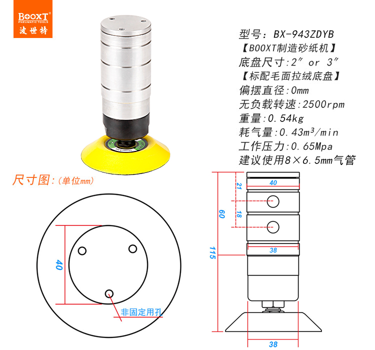• 產(chǎn)品參數(shù): 型號規(guī)格:BX-943ZDYB 【鋁合金外殼/圓柱形】 底盤尺寸:50mm/75mm (2寸/3寸) 偏擺直徑:0mm 【同心】 空載轉(zhuǎn)速:2500RPM 【慢速】 重 量:0.54KG 耗 氣 量:0.43m3/min 【同心/慢速】