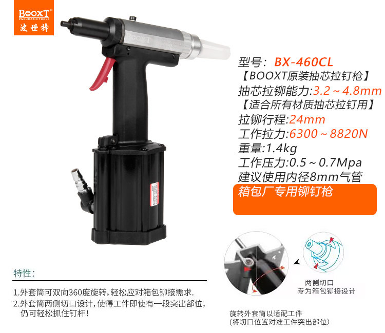 東莞市強勁五金工具有限公司提供臺灣BOOXT波世特品牌氣動工具,氣動拉鉚釘槍BX-460CL廠家直銷,首件享特價。咨詢熱線:4008301980
