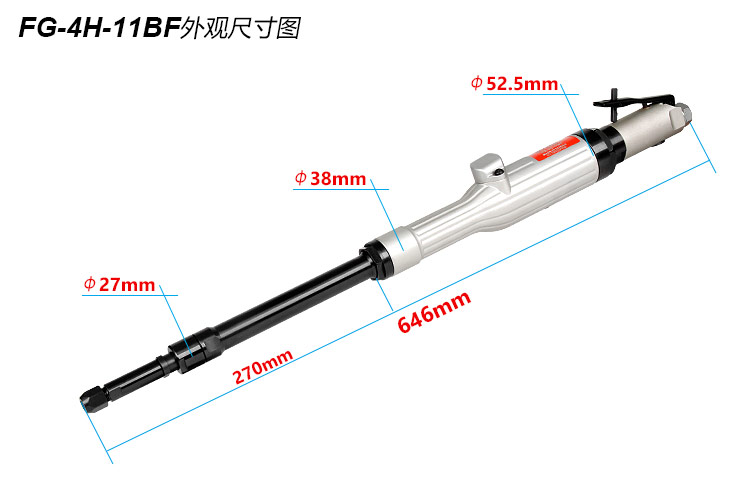 • 產(chǎn)品參數(shù): 夾頭能力:M3,6,8 【標配M6】 馬達功率:0.99HP 空載轉速:12000rpm 全 長:646mm 桿 長:270mm 桿 直 徑:27mm 重 量 : 2.5kg 耗 氣 量:0.8m3/min 【工業(yè)型/大馬力/扳機開關】