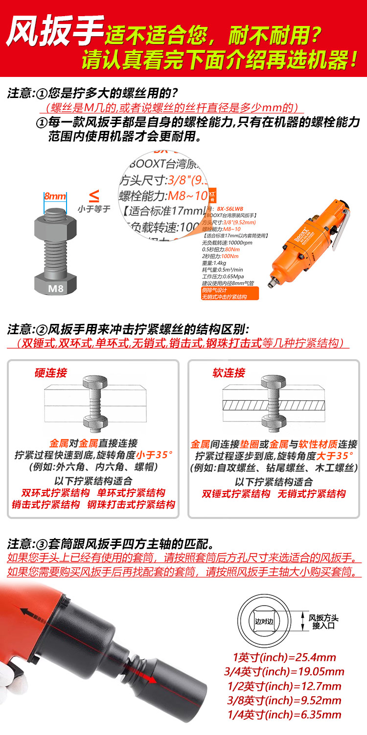 提示:因?yàn)椴煌圃旃S的測(cè)試標(biāo)準(zhǔn)不一樣,所測(cè)的扭力參數(shù)會(huì)相差比較大,另外測(cè)試扭力并不是實(shí)際螺栓擰緊的扭力(經(jīng)常有客人用這個(gè)扭力參數(shù)來(lái)選型是錯(cuò)誤的),建議沖擊式的工具選型請(qǐng)按“螺栓能力”來(lái)選,才是專(zhuān)業(yè)的。