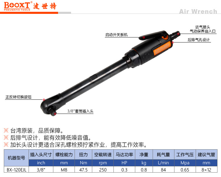 東莞市強(qiáng)勁五金工具有限公司提供臺(tái)灣BOOXT波世特品牌氣動(dòng)工具,加長(zhǎng)氣動(dòng)棘輪扳手BX-120EJL廠家直銷,首件享特價(jià)。咨詢熱線:4008301980