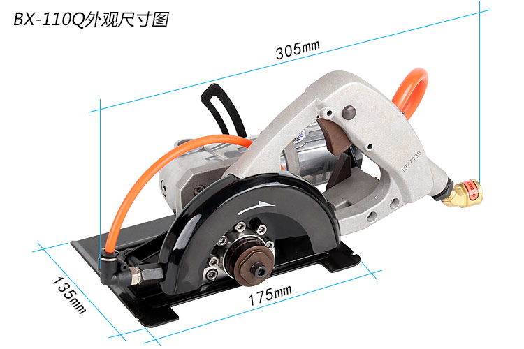 • 產(chǎn)品參數(shù): 產(chǎn) 品 型 號:BX-110Q(側(cè)排氣) 切割片尺寸:114mm 切割片孔徑:20mm/22mm 最大切割深度:30mm 空 載 轉(zhuǎn) 速:6500rpm 馬 達(dá) 功 率:470W(0.63HP) 機(jī) 身 長 度:330mm 重 量:2.92kg 耗 氣 量:0.5立方米/分鐘 噪 音 值:85db 進(jìn) 氣 口:1/4" 推薦使用氣管:內(nèi)徑8mm 使用工作氣壓:0.63Mpa